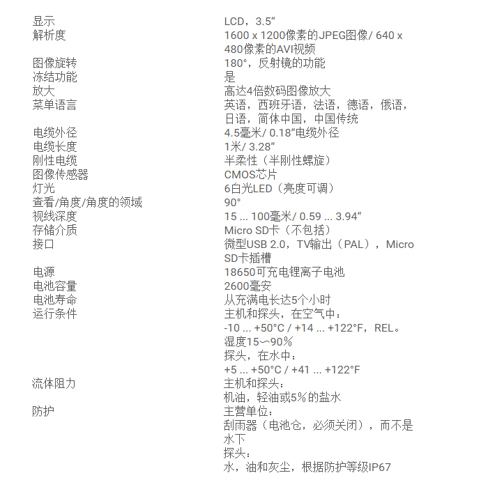 在難以到達(dá)的地方,診斷問題的理想工具,防水?dāng)z像頭擁有6個LED燈可調(diào)節(jié)亮度的佳照明。此外,***達(dá)4倍的數(shù)字圖像放大或變焦可用。