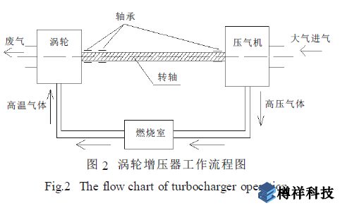 某渦輪增壓器工作流程如圖2 所示。渦輪增壓器的壓氣機(jī)和渦輪都為離心式旋轉(zhuǎn)機(jī)械, 轉(zhuǎn)軸安裝在3 個(gè)滑動(dòng)軸承上。其工作原理為: ***溫燃?xì)馔苿?dòng)渦輪旋轉(zhuǎn), 渦輪帶動(dòng)壓氣機(jī)做功, 使壓氣機(jī)進(jìn)口的常壓空氣變成***壓氣體, ***壓氣體進(jìn)入燃燒室與燃油混合后燃燒, 獲得的***溫燃?xì)庠倭魅霚u輪中做功。如此往復(fù)循環(huán)。