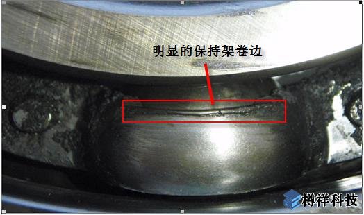 軸承拆檢后,可以看到軸承保持架已經(jīng)松脫,引起軸承保持架碰磨軸承內(nèi)圈,產(chǎn)生明顯的邊緣磨損卷邊。