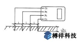 · 測量時在被測的土壤中沿直線插入四根探針,并使各探針間距相等,各間距的距離為L,要求探針入地深度為L/20cm,用導(dǎo)線分別從C1、P1、P2、C2各端子與四根探針相連接。若地阻儀測出電阻值為R,則土壤電阻率按下式計算: