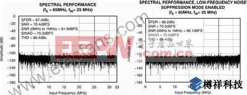 圖 2 請注意,一旦該模式被激活 1/f 噪聲(基帶附近)便被轉(zhuǎn)換為奈奎斯特,并且兩種情況下均可看到 0-1MHz 的 SNR根據(jù)奈奎斯特 (32.5MHz) 測得 65MSPS 下 ADS5282 的 SNR 為 70.4dBFS。